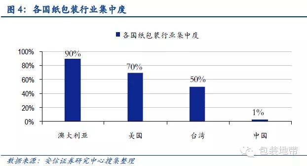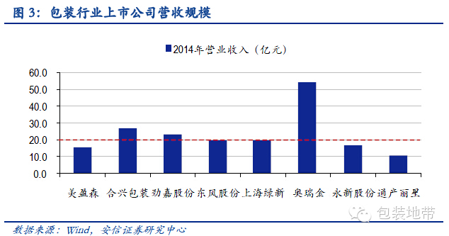 我国包装印刷行业分散,市场集中度很低。我国包装企业总数达30万家,其中规模以上企业只有2万多家,90%左右为中小企业,呈现出集群合力不大、研发能力不强、转型速度缓慢等特点。包装行业上市公司大多数营收规模仅在20亿元左右,相对于万亿市场总量来说体量很小,最大企业市场份额不足1%。与美国国际纸业IP纸包装市场份额27%、BEMIS塑料软包装市场份额20%相比,中国包装龙头企业市场集中度提升空间很大。