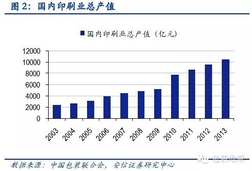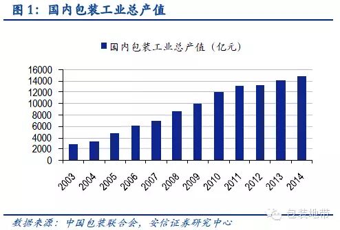 我国包装印刷行业具有万亿市场规模。近十年来,我国包装工业总产值从2002年2500多亿元,到2009年突破1万亿元,超过日本,成为仅次于美国的世界第二包装大国。2014年国内包装工业总产值完成14800亿元,包装行业社会需求量大、科技含量日益提高,已经成为对经济社会发展具有重要影响力的支撑性产业。