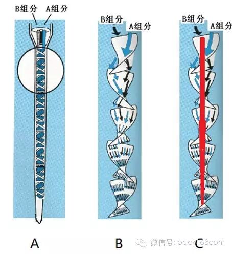 混胶机静态混合头的混合原理如图所示,图中B为正常情况下的混合效果。而如果在清洗混合头过程中不是每次都将管内的內芯掏出来清洗,就很容易造成C的情况发生,在静态混合头的中间形成一个通道,从而胶粘剂未能进行充分混合,导致复合后发粘的现象。