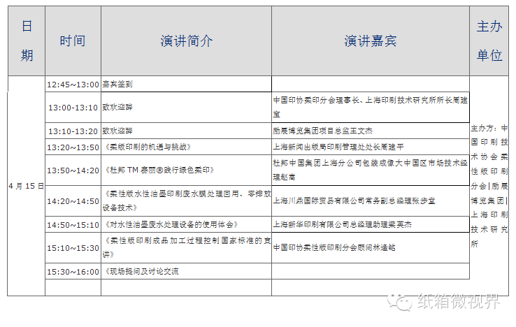 为了在瓦楞纸箱和彩盒的印刷上推广柔印这一当前印刷领域最环保的工艺,2015中国国际瓦楞展期间,由中国印刷技术协会柔性版印刷分会、励展博览集团、上海印刷技术研究所将于2015年4月15日下午在上海新国际博览中心联合举办主题为“柔印让环境更美好”的“2015柔印发展高峰论坛”。