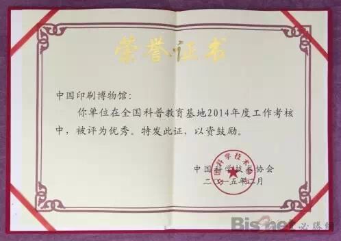 由中国科学技术协会组织开展的全国科普教育基地2014年度工作考核评审日前揭晓,中国印刷博物馆荣获2014年度“优秀全国科普教育基地”称号,此次评选共从全国363个基地中评出了75个优秀基地。