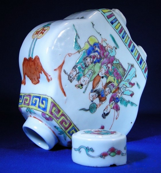 民国“坤记氏出品”,粉彩人物天女散花六方茶叶罐: