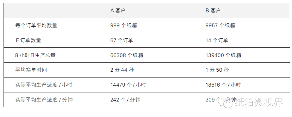 我们可以看到一天8小时内,大订单客户可以生产近14万个纸箱,做了14个订单。同样,对于小订单为主的客户来说,一天8小时的生产时间内还能做67个订单,生产6.6万个纸箱,该设备的瞬间换单系统能弥补生产小订单所造成的损失。而使用传统设备的换单时间很长,67个订单仅设置换单时间都远远超过8个小时,更别说生产了。