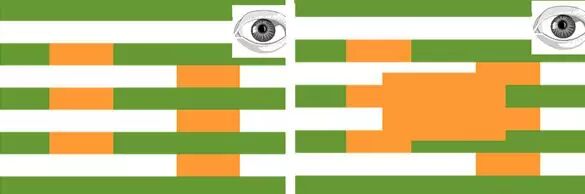 左边的图在背景颜色的影响下,两边的橙色块颜色看起来不一致。但右边的图说明这两边的橙色是一个颜色。