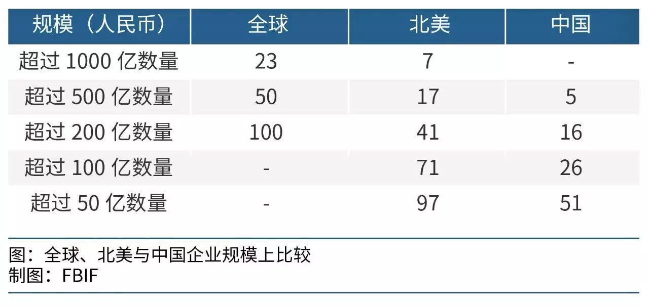另外,根据我们统计的全球千亿(人民币)、百亿级等企业,也可以看到中国尚未有千亿级的企业,全球有23家,美国占了7家。在北美,超过百亿的企业数量也十分可观,达到71家。中国仅有26家。