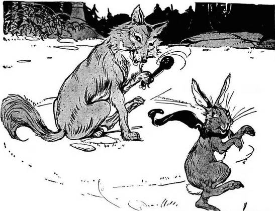 于是,兔子离开洞口,跑进森林深处,他见到一只山羊:“你相信兔子能轻松吃掉狼吗?”山羊不信,于是兔子把山羊领进山洞。