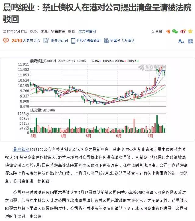 本案后续发展有待观察。 需要指出的是,香港法官目前只是驳回了晨鸣纸业要求法院禁止Arjowiggins申请晨鸣纸业清盘的诉请(一个双重否定,有点绕),但并不意味着法官已经要求将晨鸣纸业清盘。据财经媒体分析,晨鸣纸业总资产规模超过800亿,市值超过200亿,总体财务状况尚属健康,为了区区数亿元的债务最终闹到清盘、退市的风险并不高。