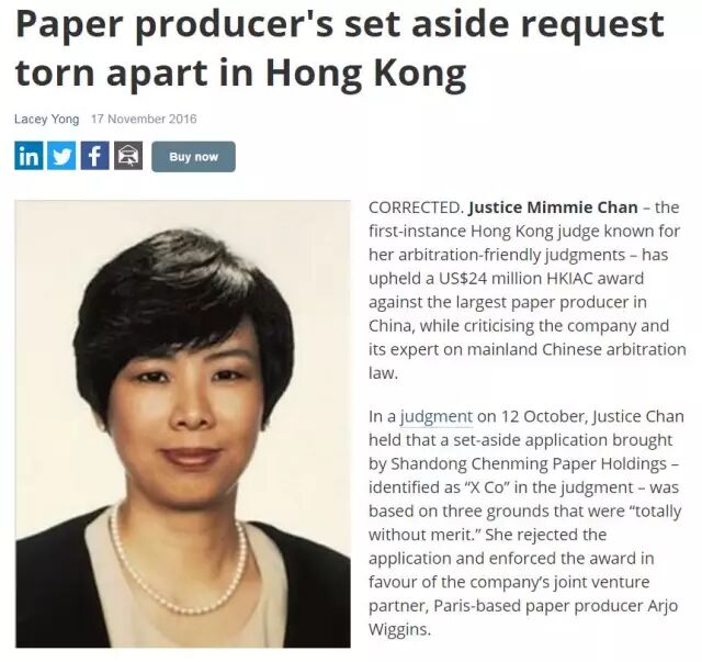 扯两句闲话——司法实践中的措辞差异其实是比较内地、香港司法文化一个有趣的看点。“缺乏事实依据/没有事实依据”这样的表述在内地判决文书中司空见惯,基本上属于法官的中性评价。而在香港法语境下,totally without merit大概属于非常严厉的批评,以至案件当时也曾被Global Arbitration Review报道。转贴一下当时报道的页面,顺便让读者认识一下香港仲裁界最重要的人物之一、本公号多次提到的Mimmie Chan法官。