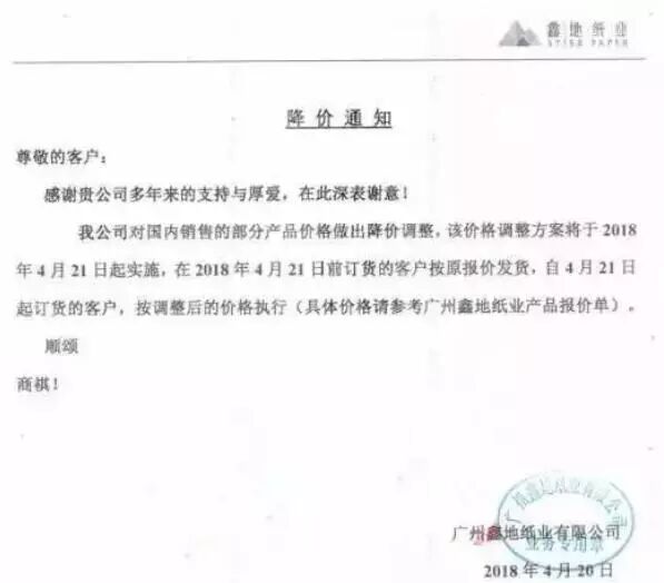 4月20日,主做特种纸的广州鑫地纸业向客户发出降价函,宣布对部分产品价格做出降价调整,并附上了具体的产品价目表。